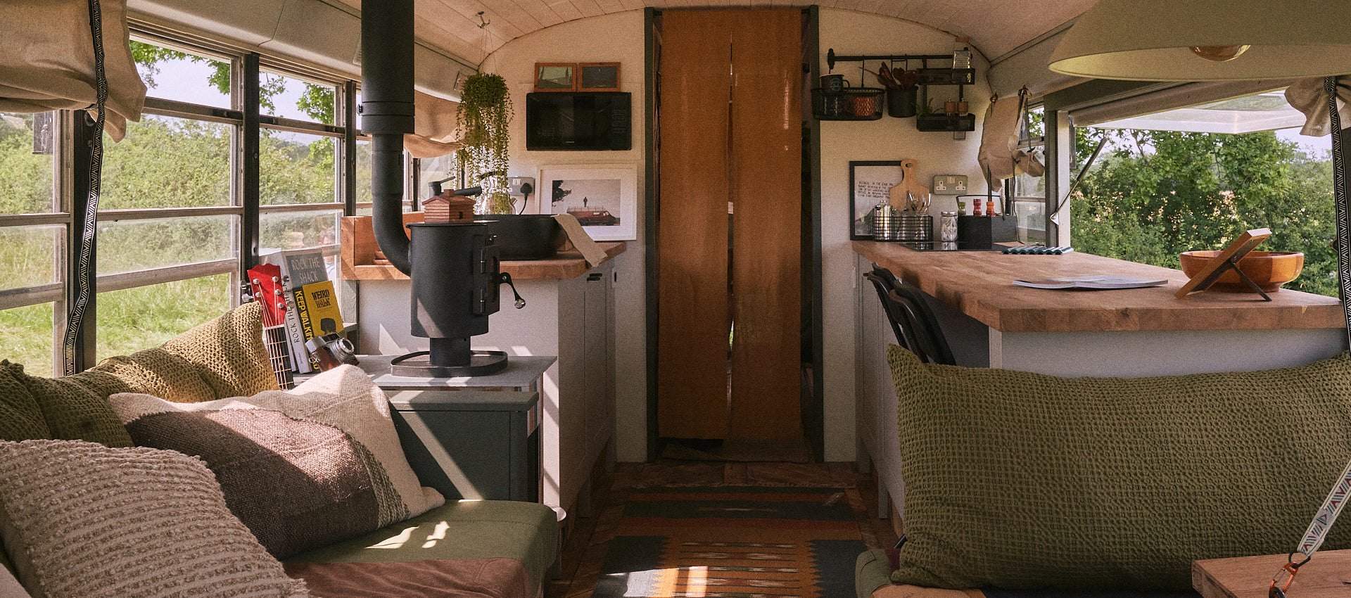 Little Firs has a double bed and two single bunk beds above it. A bespoke-built wash hut is a few steps from the bus where you can enjoy a hot rainfall shower, with compost loo and sink.
